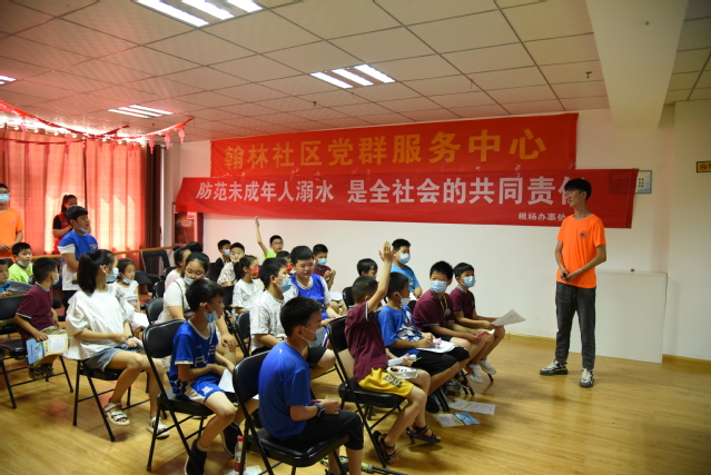 志愿者通过诙谐幽默的语言及儿童防溺水安全教育片,使小朋友们认识了哪里是危险水域、为什么会发生溺水、游泳的注意事项以及发生溺水后应如何求救等防溺水知识。在问答环节,志愿者结合“入水前的热身”“如何安全游泳”“水里手脚麻痹怎么办”“同伴落水怎么办”“河岸边行走时的注意事项”等要点进行提问,小朋友们你争我抢、纷纷举手作答。最后,志愿者与孩子们共同朗诵了儿童防溺水警句,学习了儿童防溺水儿歌,活动在响亮的儿歌声中圆满结束。