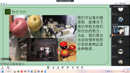 活动中,团支书带领同学们学习了习近平总书记关于制止餐饮浪费行为的指示精神,分享了我国粮食生产取得连年丰收走过的不平凡道路,学习了解了习近平总书记勤俭节约的事迹。团支书带领班级同学共同观看勤俭节约的视频资料,探讨绿色发展理念,号召大家将勤俭节约精神于生活小事中体现,珍惜每一餐饭,节约每一粒粮,实施“光盘打卡行动”,杜绝舌尖上的浪费,“自然光线充足时不开灯,杜绝‘白昼灯’、‘长明灯'”,“离开宿舍时做到人走电断”。在讨论环节,同学们畅所欲言,分享自己在生活中遇见的“文明轻大”故事。大家纷纷表示,要从小事做起,厉行节约、反对铺张浪费。