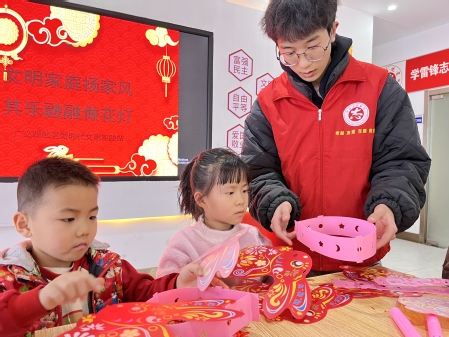 巧手制作花灯,传承民俗文化。返乡学生在社区工作人员的带领下学习花灯的做法,协助工作人员布置了场地,在活动开展过程中为社区儿童讲解花灯的做法以及花灯的来历,帮助孩子们完成手中的花灯,使大家更加了解中国传统节日中所蕴涵的文化内涵。