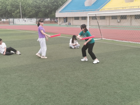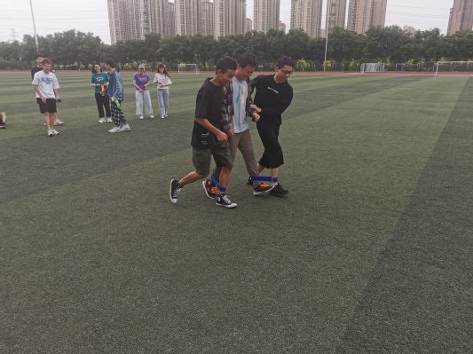 活动伊始,同学们围成一圈,依次说出下一位同学的优点,在此过程中,大家认识到了同学眼中闪光的自己,增强了同学间的亲密度。随后,进入第一个游戏环节“五人四足”,以寝室为单位,每个寝室派出五个人进行比赛,用时最短获胜,同学们在游戏的同时也深切感知团队协作的重要性。最终,男生寝室201用时最短,取得比赛胜利。在 “蒙眼敲击”环节中,双方戴上眼罩,手持蓝色红色充气棒,依据声音用充气棒敲击,其中击中三次任意身体部位为胜,活动进行的如火如荼。同学们释放了心中的压力,欢声笑语充盈着操场。