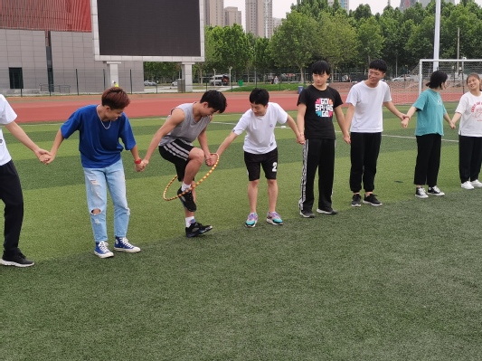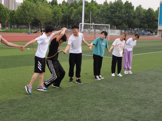 活动开始,同学们在主持人的带领下,分为两组,手拉手站成一排。开始“呼啦圈大挑战”,由每排的第一个同学手持呼啦圈,将呼啦圈穿过自己,依次传给下一个人,同学们积极配合,默契十足。随后进行了“对对碰”活动,音乐响起,同学们围绕着凳子转圈,由主持人发布指令,同学们将自己的身体部位紧紧贴在一起,增强了彼此的亲密度。最后的“解开心心结”活动,同学们手拉手围成圈,席地而坐,分享内心的情感,通过倾听诉说,同学们释放了情绪,也提高了班级凝聚力。
