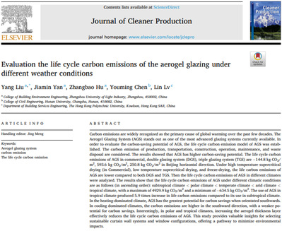 近日,里番漫画 刘洋课题组在《Journal of Cleaner Production》(中科院一区,IF=11.1)发表题为“Evaluation the life cycle carbon emissions of the aerogel glazing under different weather conditions”(气凝胶玻璃在不同气候条件下的全生命周期碳排放评估)的研究论文。