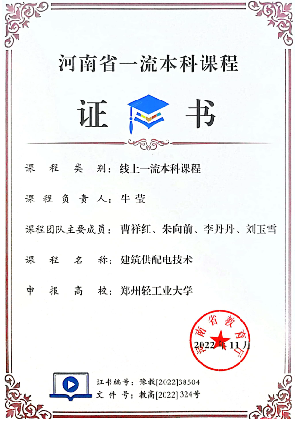 牛莹,副教授,硕士生导师,《建筑供配电技术》河南省线上一流本科课程、河南省精品在线开放课程负责人,主讲教师。《电气照明技术》国家级一流课程主讲教师,全国高等学校建筑电气与智能化专业联合毕业设计特等奖指导教师,第二届全国高等院校工程应用技术教师大赛三等奖获得者。