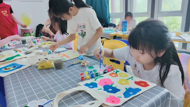此外,志愿者们还安排了帆布包绘画活动。在志愿者的指导下,小朋友们拿起画笔和颜料,在帆布包上尽情挥洒自己的灵感与创意。可爱的卡通形象、唯美的风景、独特的抽象图案……各种精彩设计层出不穷。在绘画的过程中,小朋友们不仅展现了自己的个性和才华,还培养了自己的耐心和创造力。