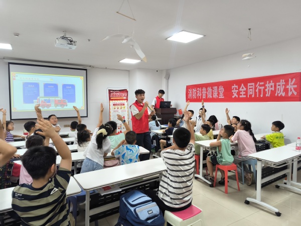 活动中,小朋友们不仅系统学习了消防安全基础知识,还掌握了灭火的基本方法。志愿者们通过实物展示,让孩子们认识了生活中常见的消防器材和消防标识,并重点讲解了家庭中需要注意的易燃物品。互动环节中,“哪些行为可能引起火灾?”“遇到火灾如何正确报警?”“为什么要用湿毛巾捂住口鼻?”等趣味问答引发了孩子们的热烈讨论,大家争先恐后地举手回答,童言童语间传递着小朋友对消防安全知识的理解。活动最后,志愿者们教唱了朗朗上口的消防儿歌:“你拍一我拍一,小孩不玩打火机……”孩子们清脆的歌声为这场寓教于乐的消防安全知识讲座画上了圆满的句号。